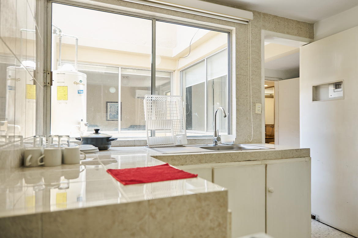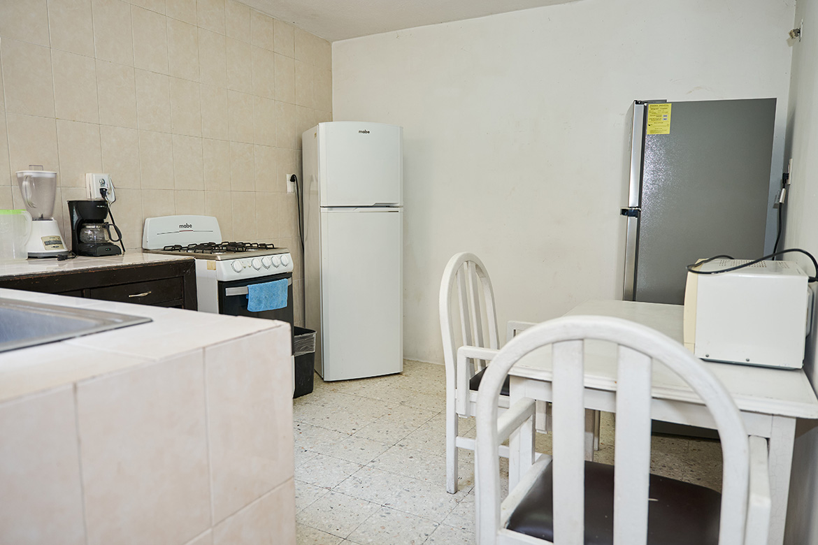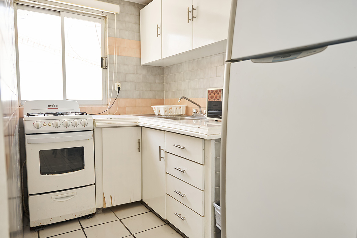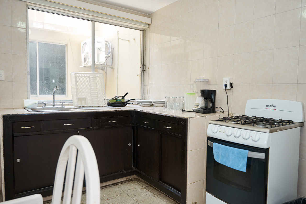 Cocina con estufa, microondas, refrigerador y utensilios para preparar tus alimentos con total comodidad.